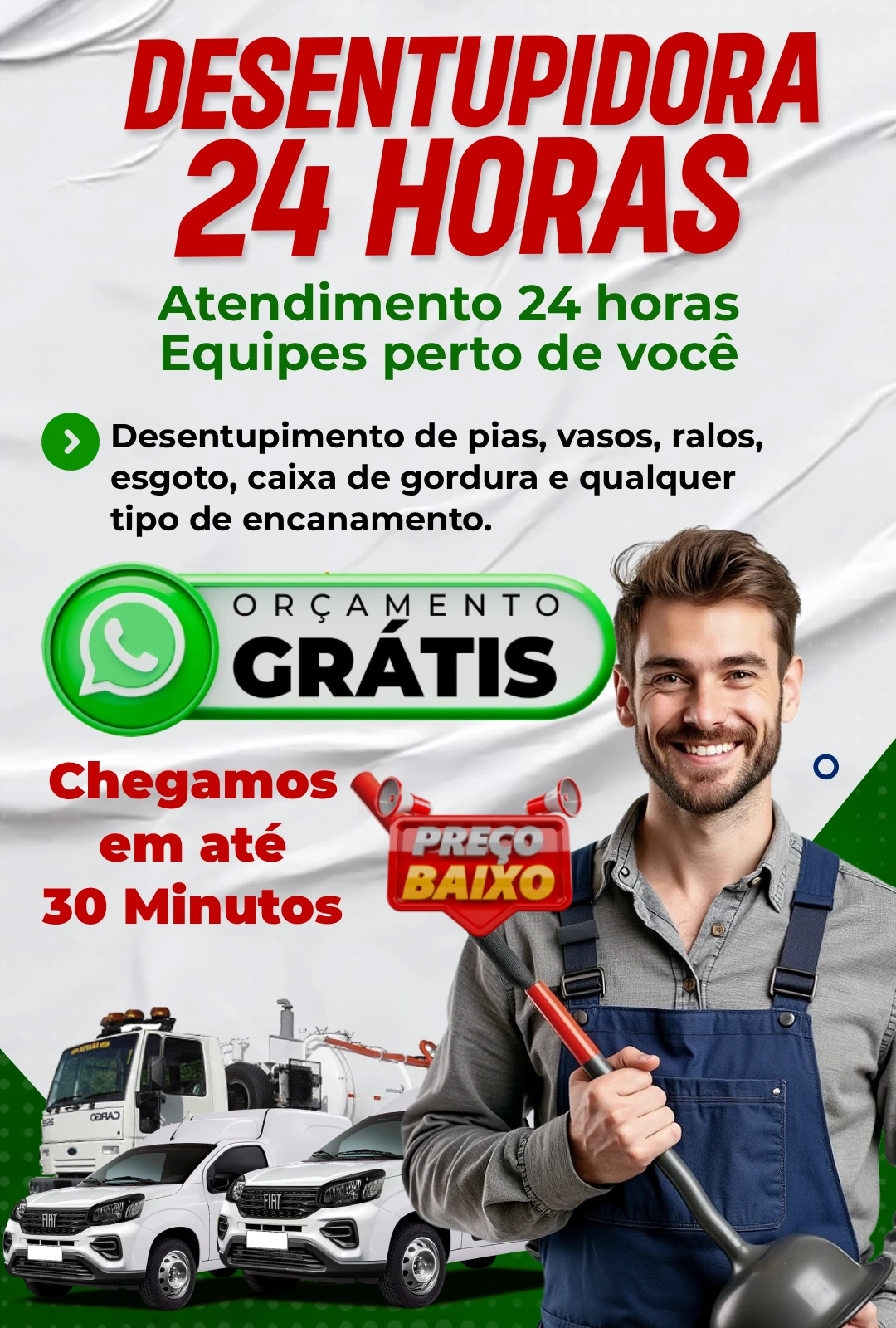 Trabalhamos com rapidez, eficiência e preços justos para atender residências, condomínios e empresas. Conte com nosso atendimento 24 horas e soluções definitivas para qualquer tipo de entupimento!